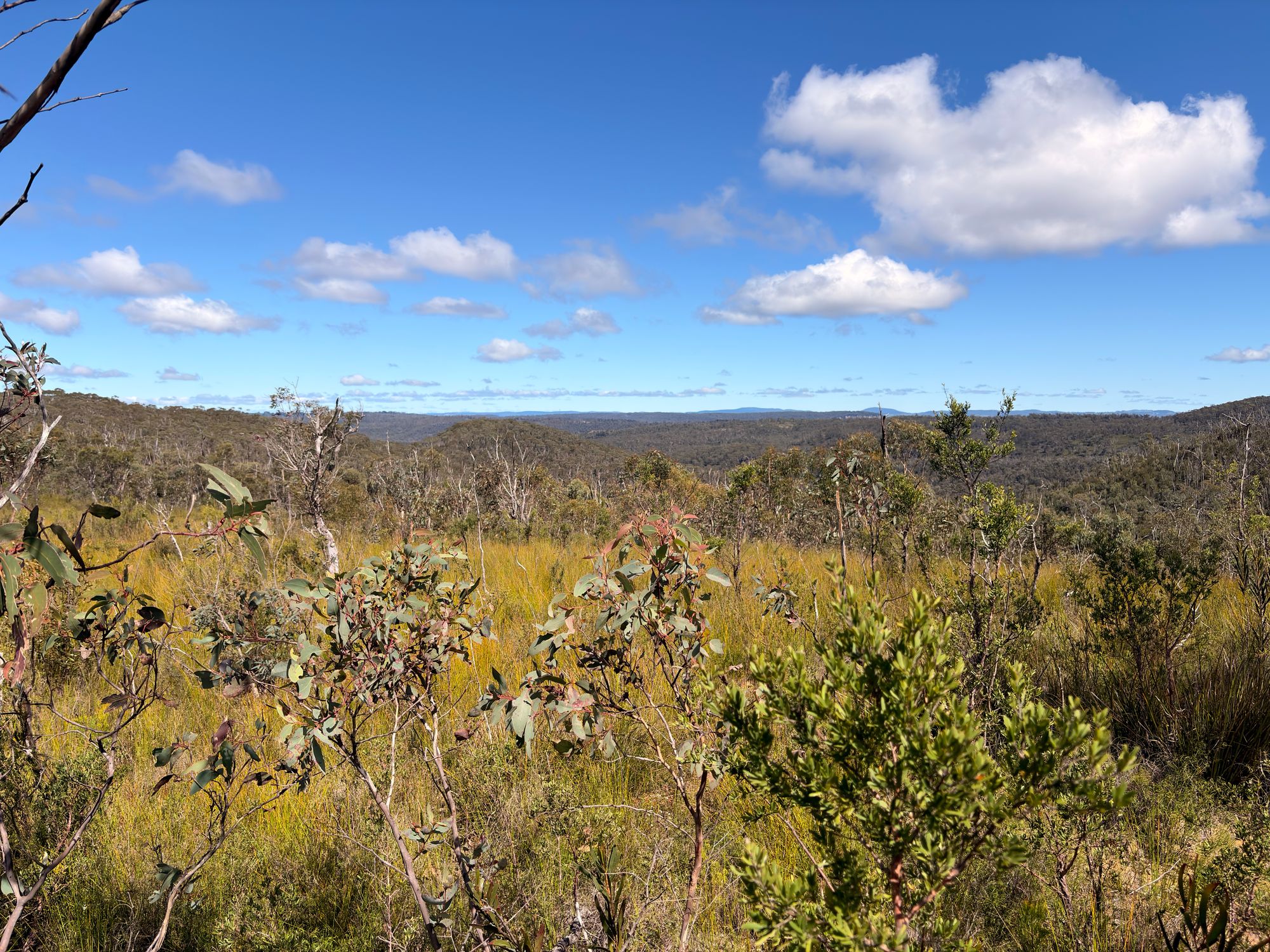 I walk under the massive power lines, and I’m greeted by native grasses and trees. The bush here is lovely. There was a massive fire here, and it shows. All the mature trees are dead and silver. But the bush is regenerating. The new growth looks healthy, and the grasses are back. There are two main species of tree here. Both are regenerating with new young trees.