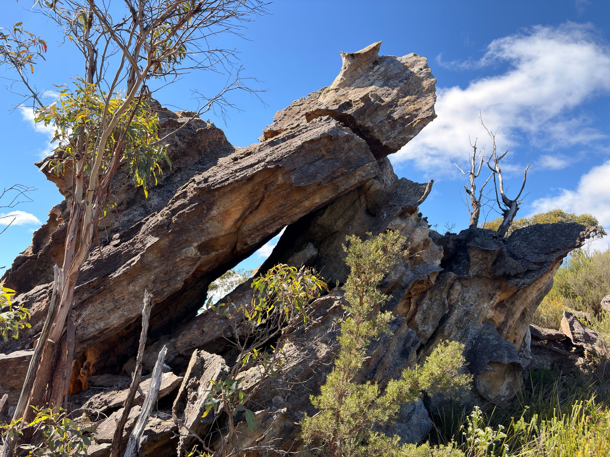 As I walk along the trail, I get a small glimpse through the trees of North West part of Grose Valley. The walk is easy, and the trail is well defined. I pass what looks like an old, collapsed pagoda. The whole large structure is sitting at a 45 degree angle.