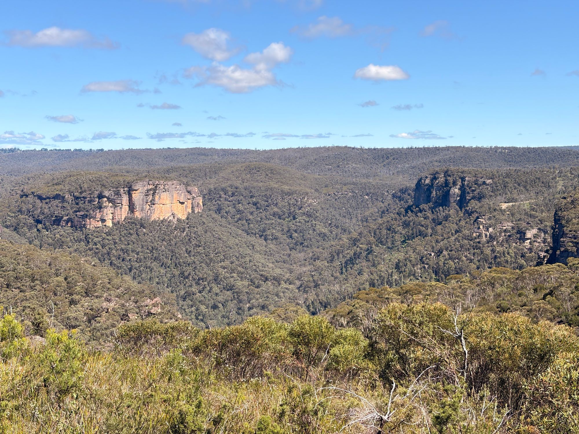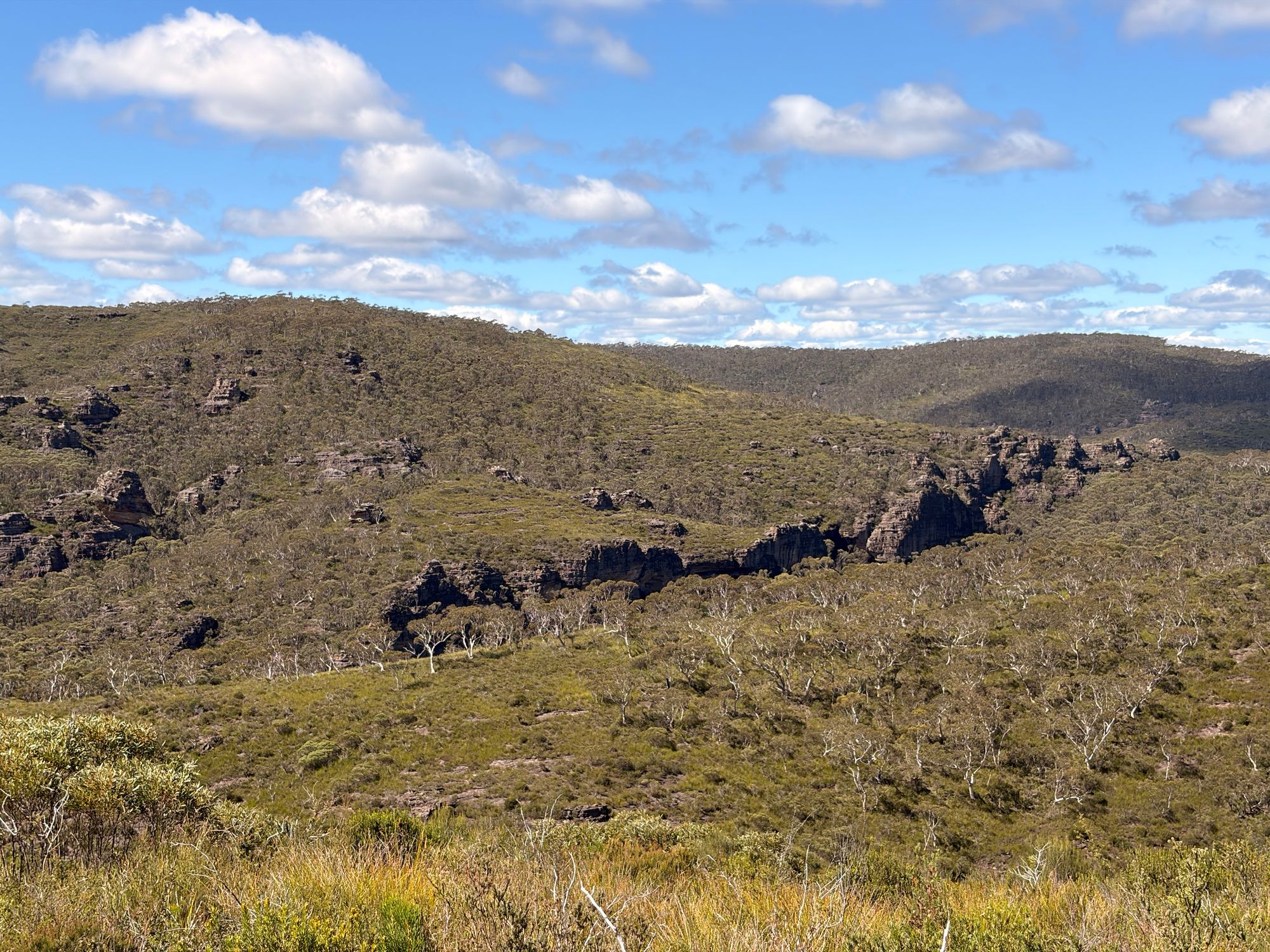 Shortly after, the trees disappear, and the view reveals itself. The views are amazing. I get to the end of the ridge and start descending down the spur. The bush changes to grasses and short shrubs. The view of the The Grose Valley is blocked by Wilkinson Hill.