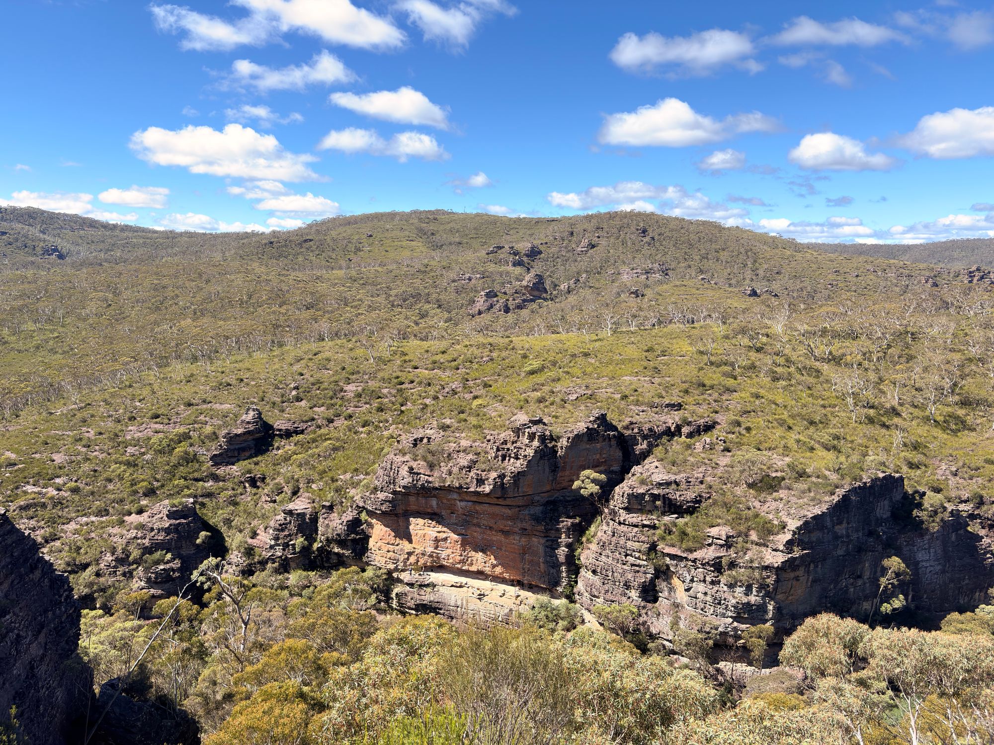 The Jungaburra Brook canyon reveals itself, and the trail ends at a cliff top. There is a scramble down to the valley, but it’s not a high-traffic trail. There are various rock faces. I look across, and I see rock climbers on the rock faces. I sit down and have lunch, watching the climbers on the cliff face. I hear other hidden climbers somewhere else in the valley yell with excitement as they fall safely.