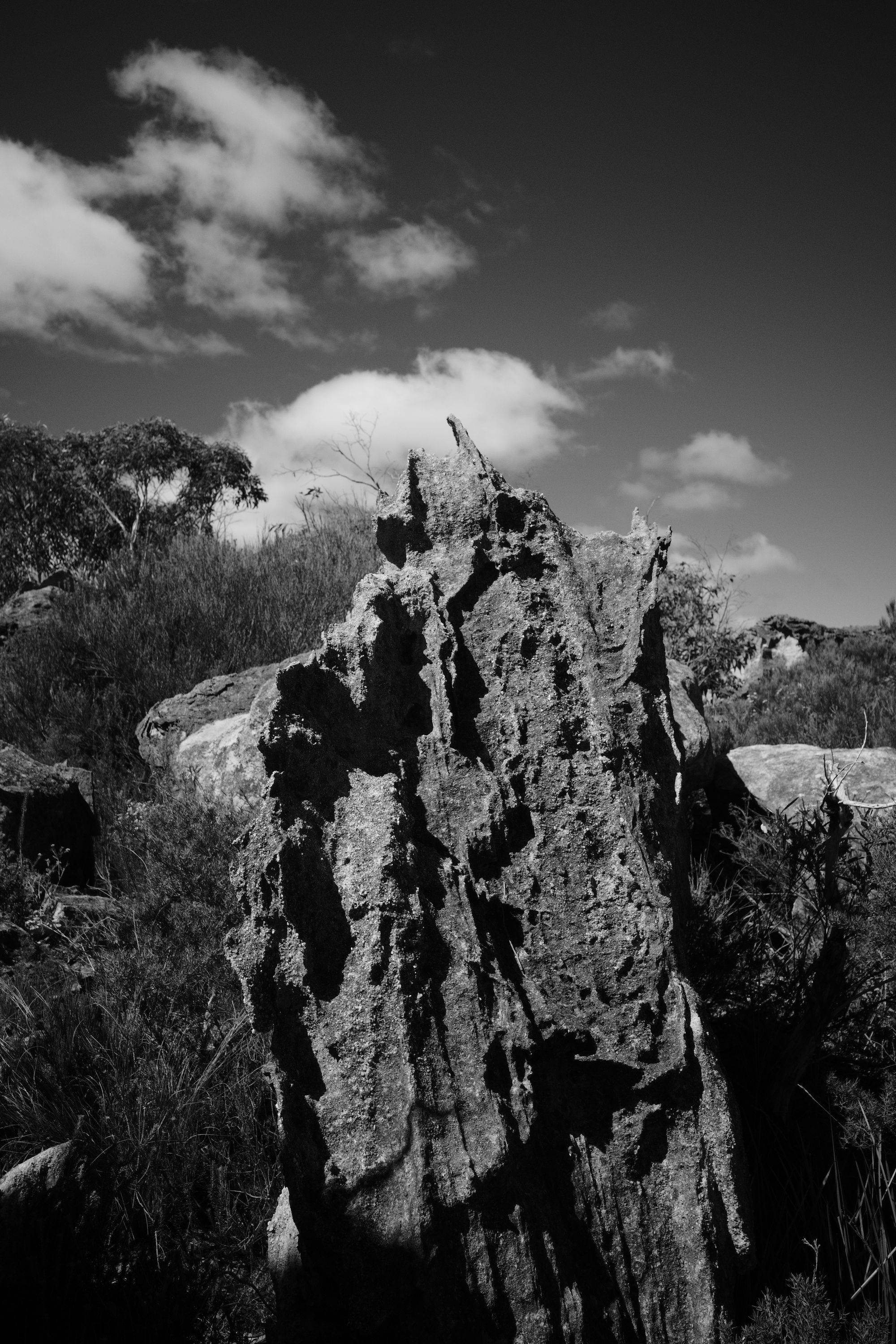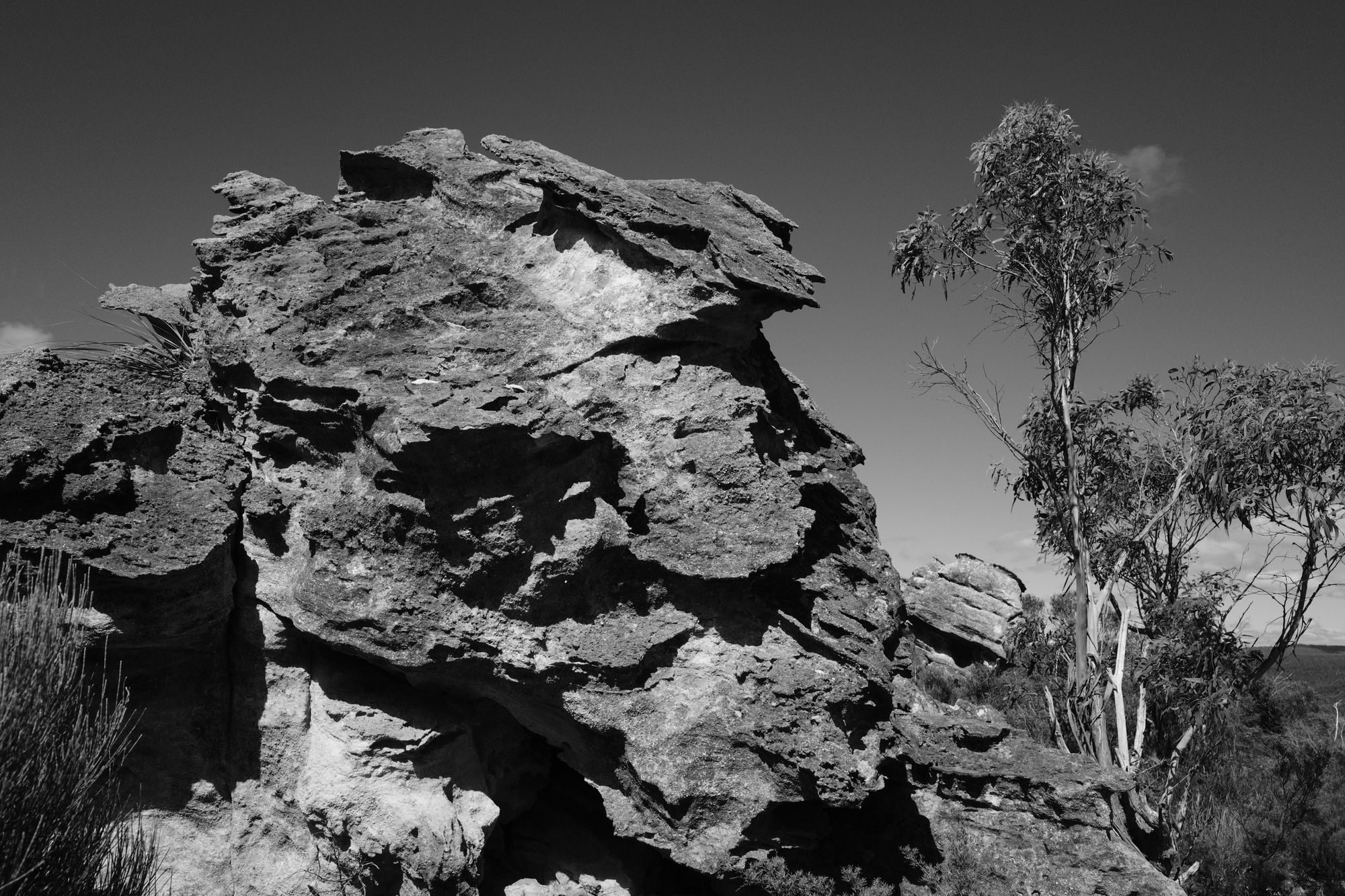 As I walk along the trail, I get a small glimpse through the trees of North West part of Grose Valley. The walk is easy, and the trail is well defined. I pass what looks like an old, collapsed pagoda. The whole large structure is sitting at a 45 degree angle.