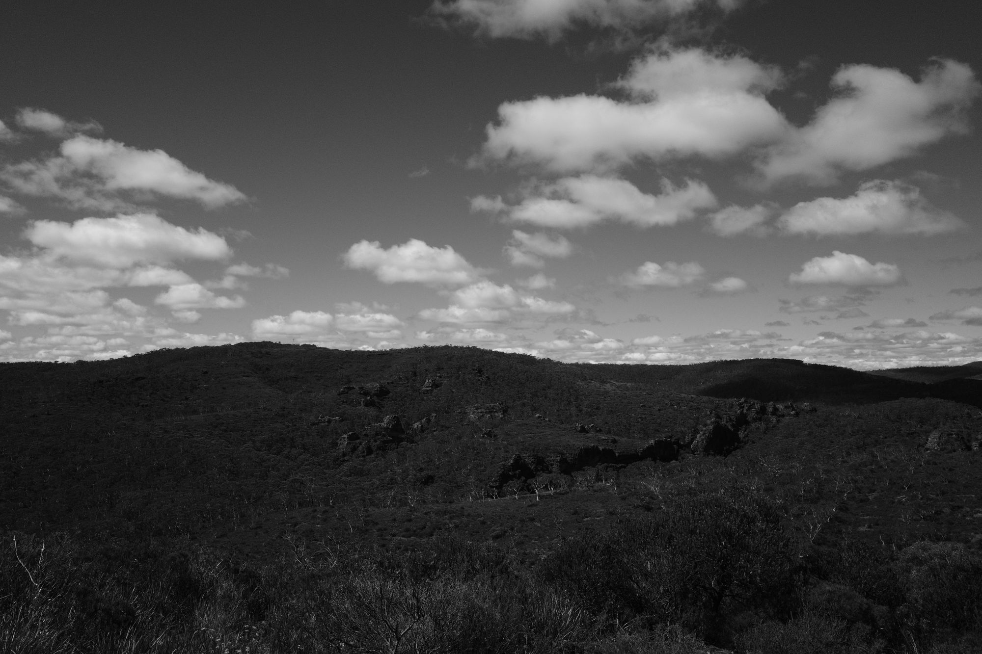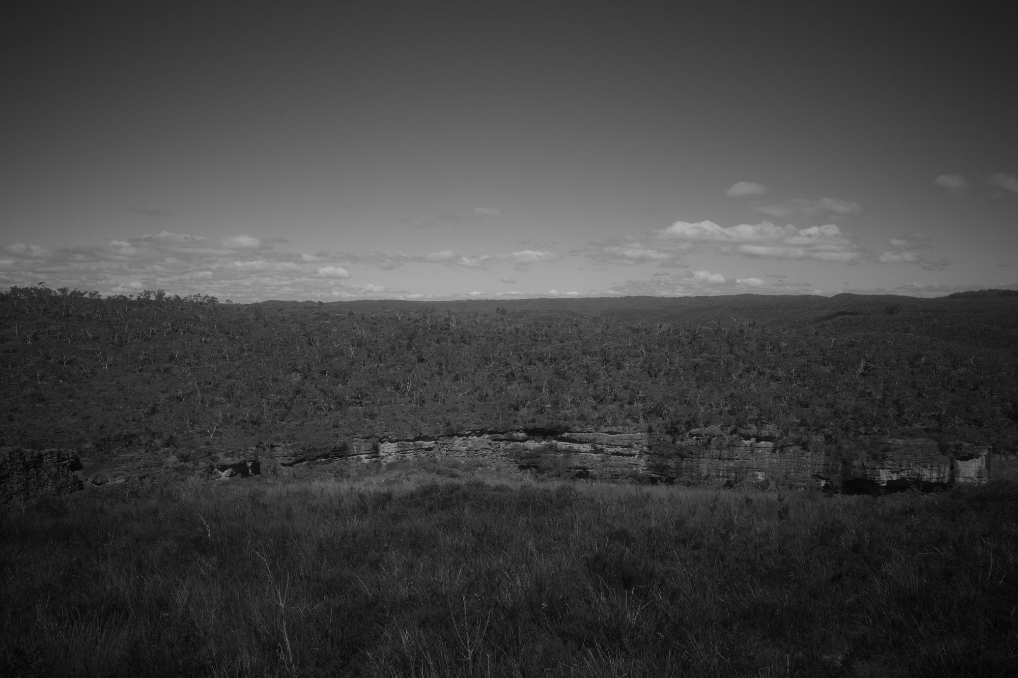 Shortly after, the trees disappear, and the view reveals itself. The views are amazing. I get to the end of the ridge and start descending down the spur. The bush changes to grasses and short shrubs. The view of the The Grose Valley is blocked by Wilkinson Hill.