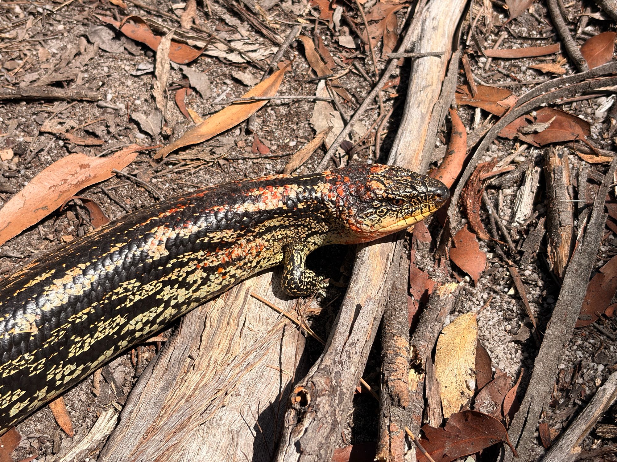 Almost immediately after I spot a beautiful Blotched Blue-tongue lizard - Tiliqua nigrolutea (Northern upland form), it has beautiful yellow and salmon-red blotches. This is the first time I’ve spotted this species, so I’m pretty happy. It lets me photograph it. I carefully step over the rather large Blue-tongue and continue on.