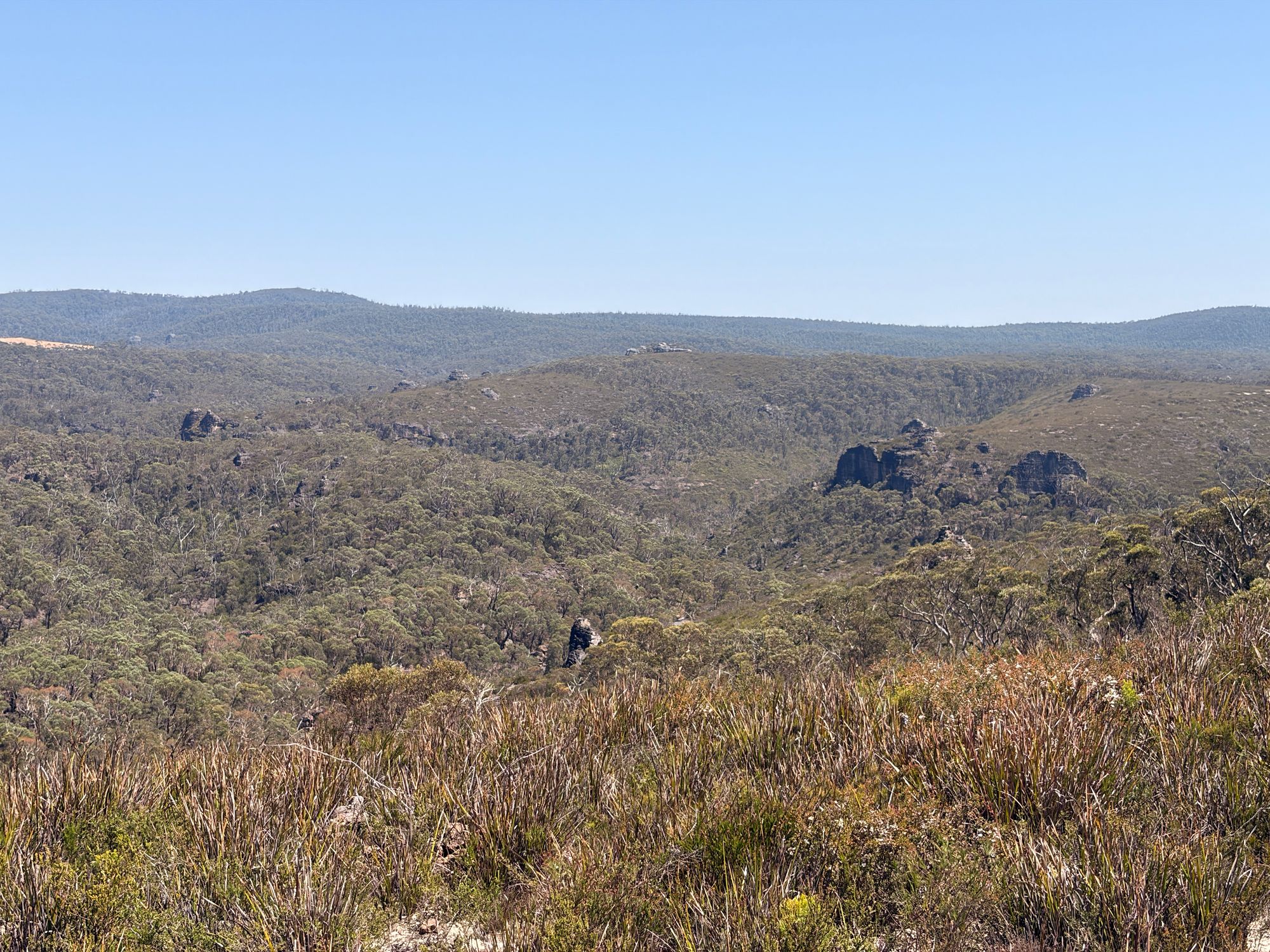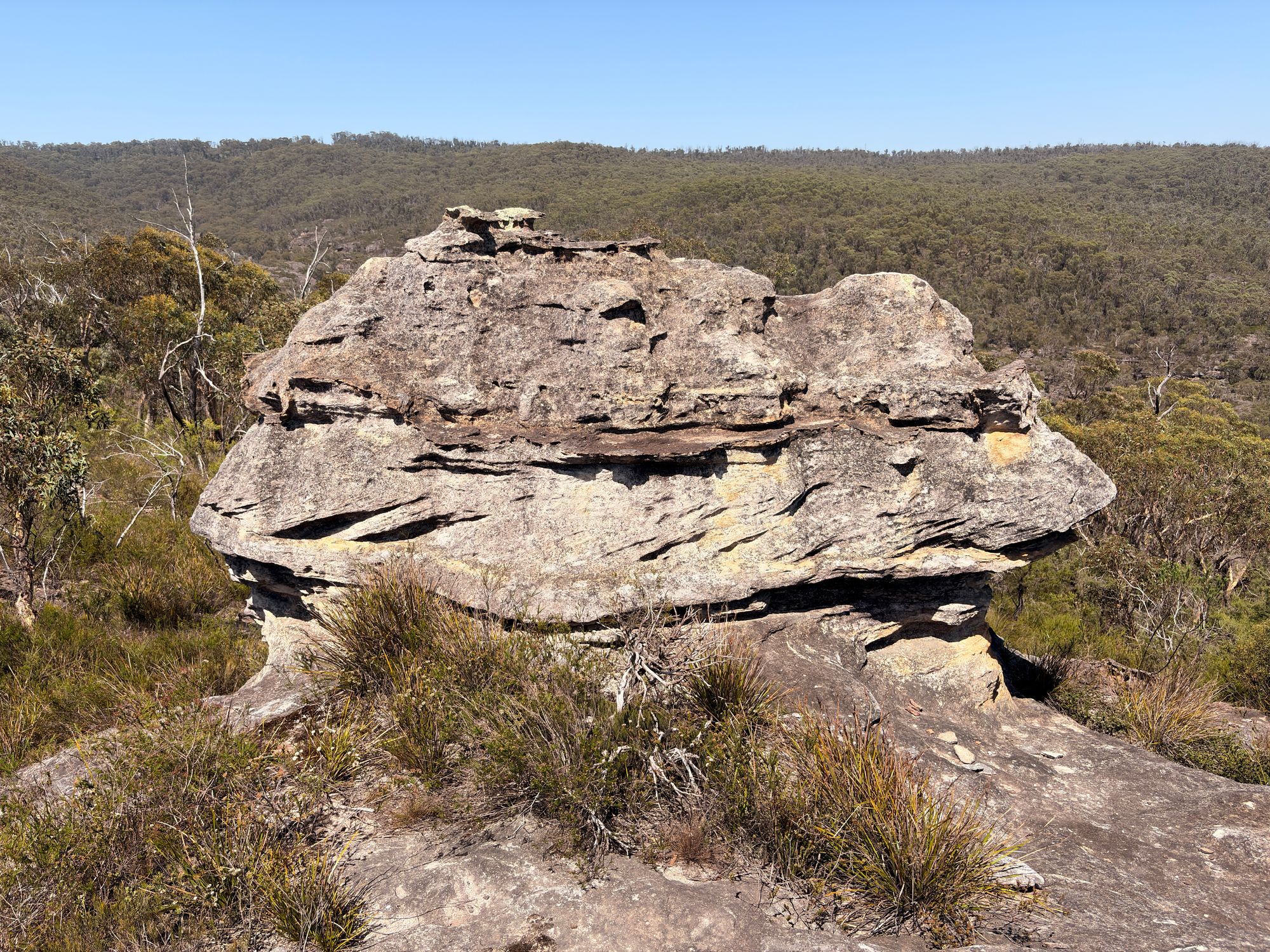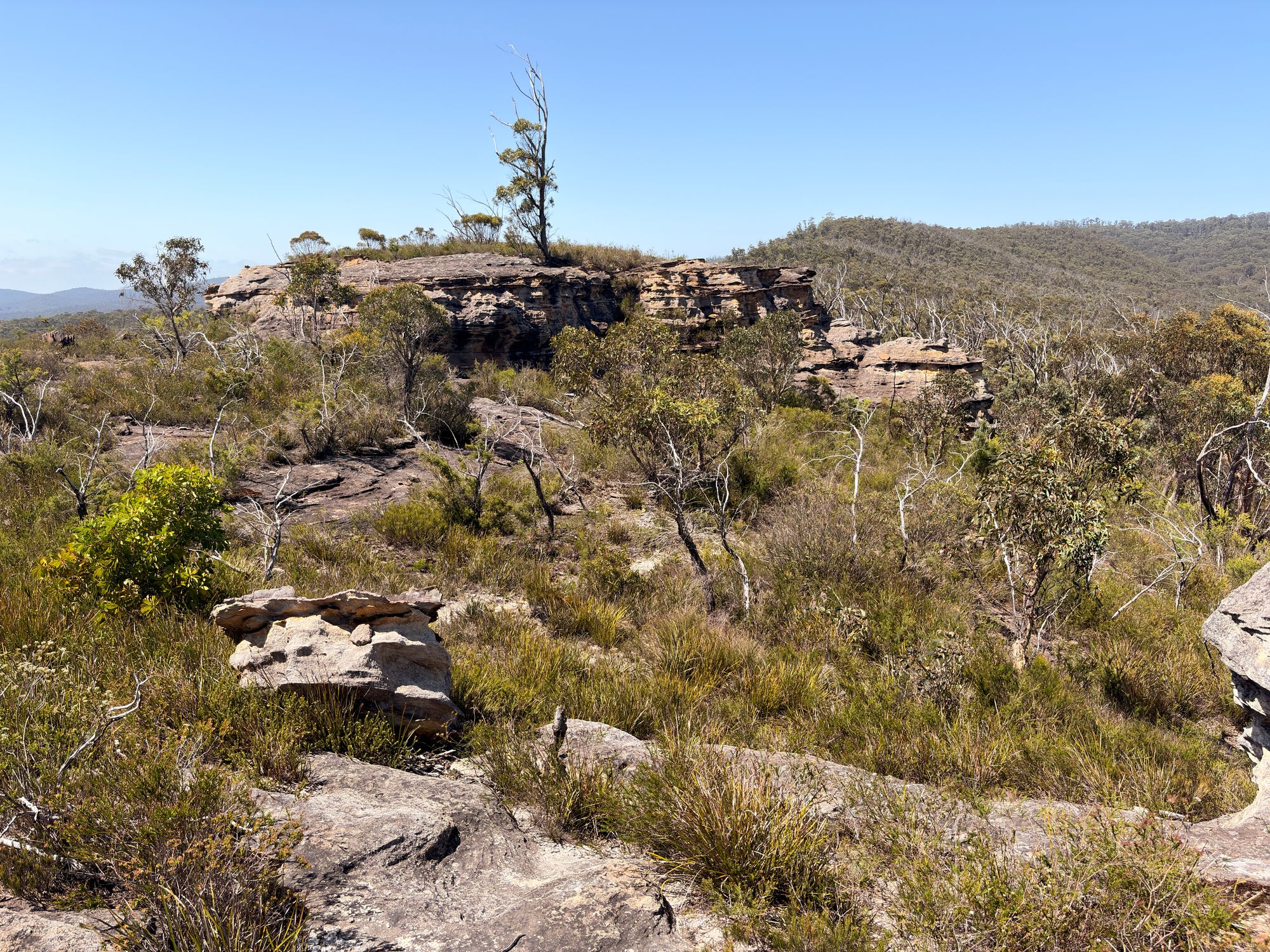 After about 2 km, I hit the first Pagoda rock formation. Pagodas are these stepped rock formations found in the Blue Mountains. Almost always above or around 1000m elevation. I continue on and find a large outcrop of Pagodas. The 360 degree views at the top are remarkable. From the top looking East, I can see Submarine Rock and where I have walked over there.