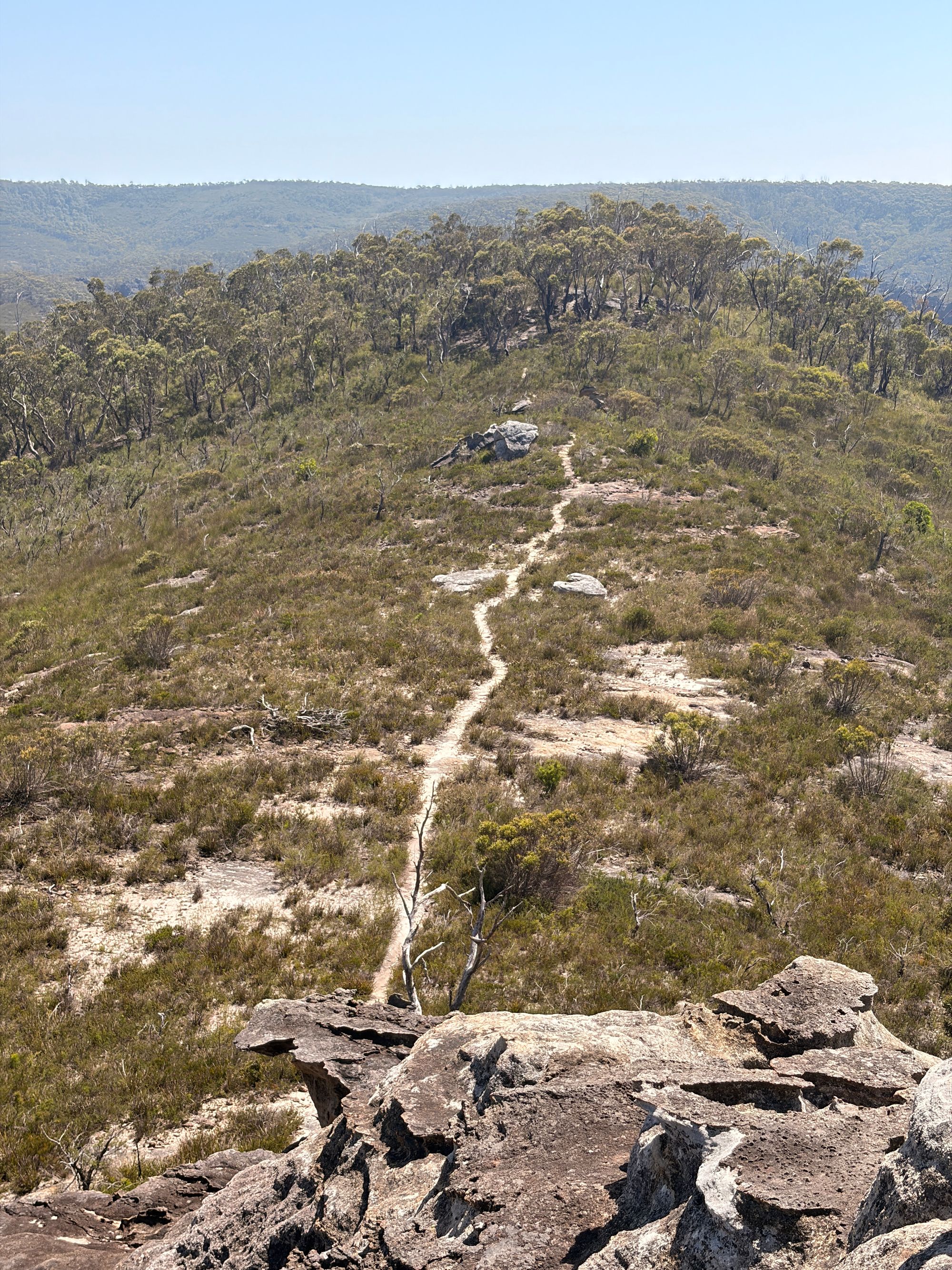 The bush is nice. Sparse gum trees, grasses with the odd shrub. The start of this trail follows a long spur initially. I spot a few Waratahs that have finished flowering and have created seed pods. There is very little flowing in the bush. Looking around, I think this bush would be great when in flower.