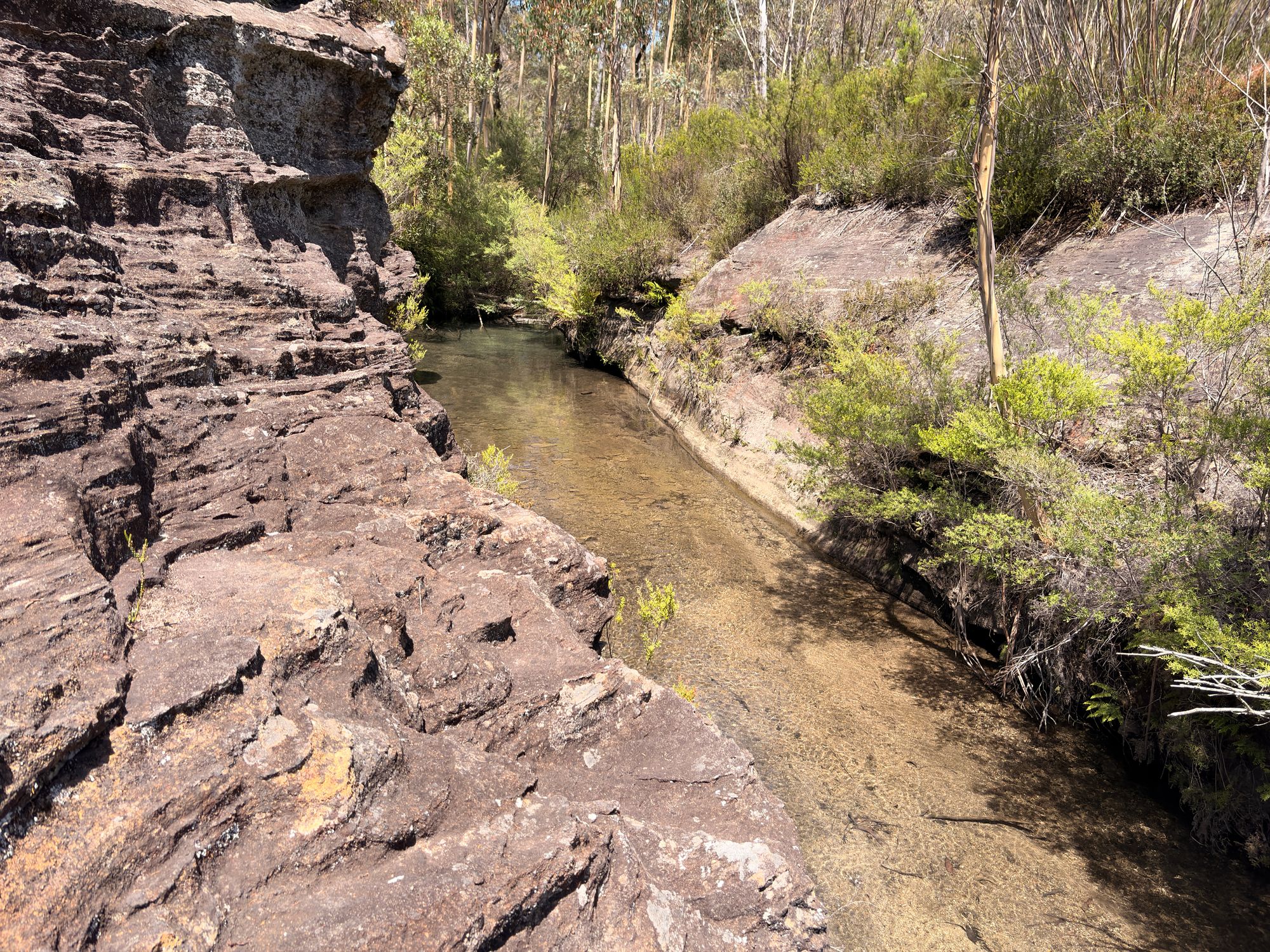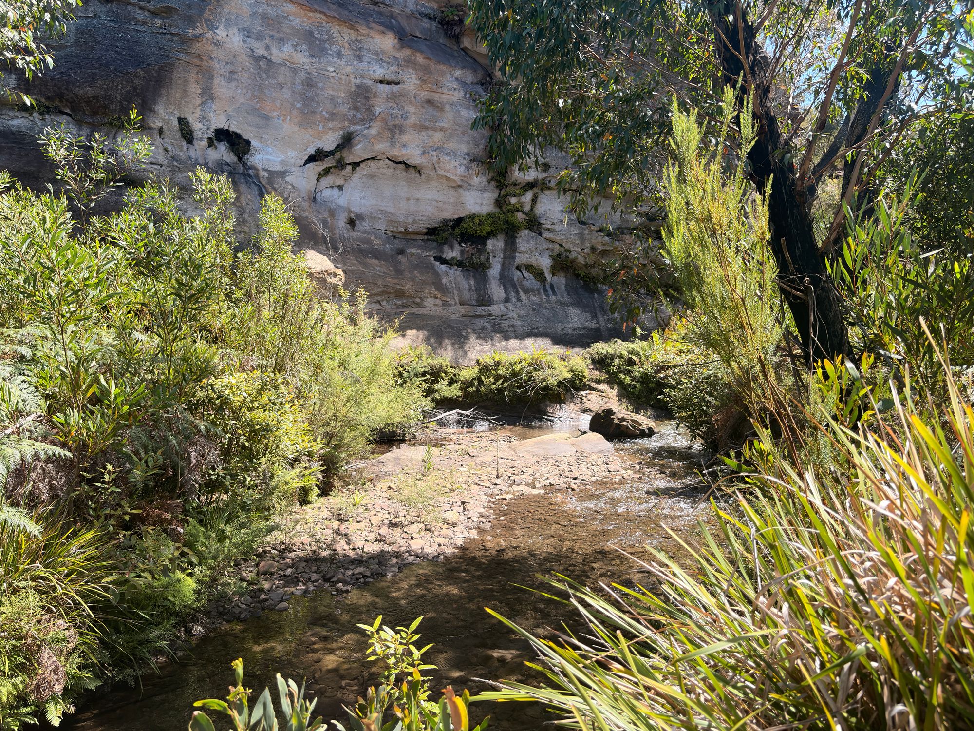 After deciding to change up the planned walk. I start to descend down the other trail. It’s a bit steep but nothing outrageous. A little bit of minor scrambling down the sandstone. I can hear the river as I get closer. Once I arrive, I’m greeted with a calm, flowing Wollangambe River. I explore around, crossing over the river and having a bit of a look. It’s a nice spot. I see that upstream it’s sandy and flat. I’m strip down and hop in. It’s freezing, but well worth it. I relax for some time in the river. I examine the chunky sand and look at all the different types of rocks. After a while, I decide I kinda need to return home. I hop out, dry off, and have some lunch.